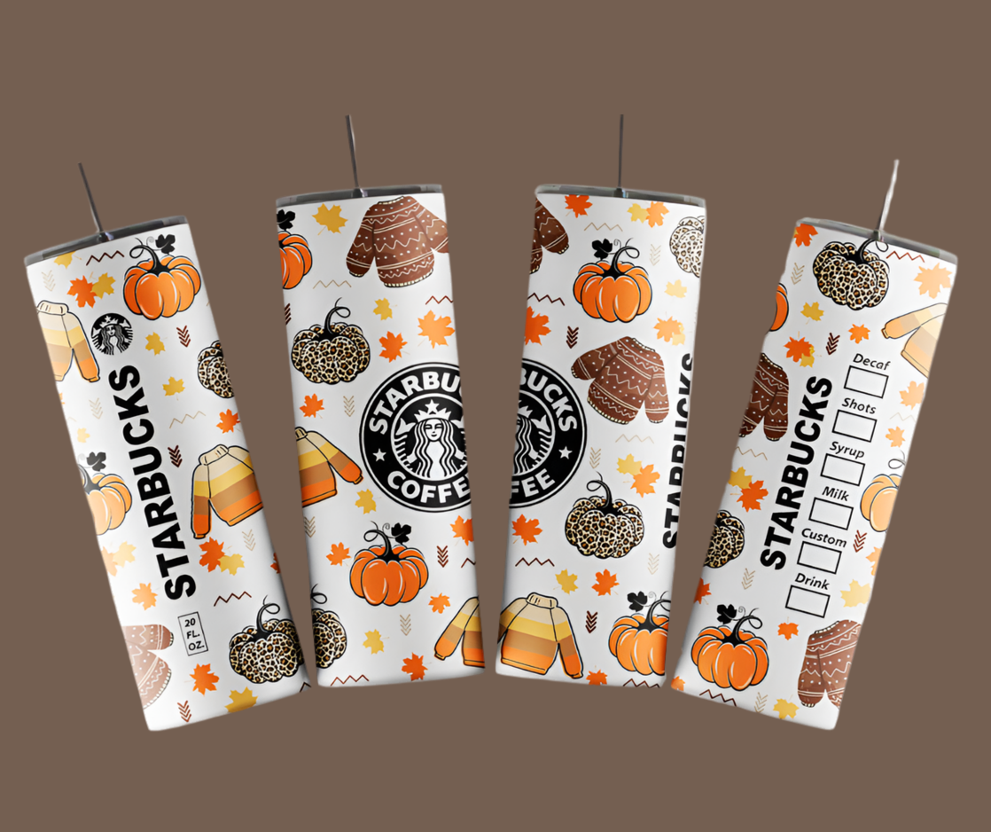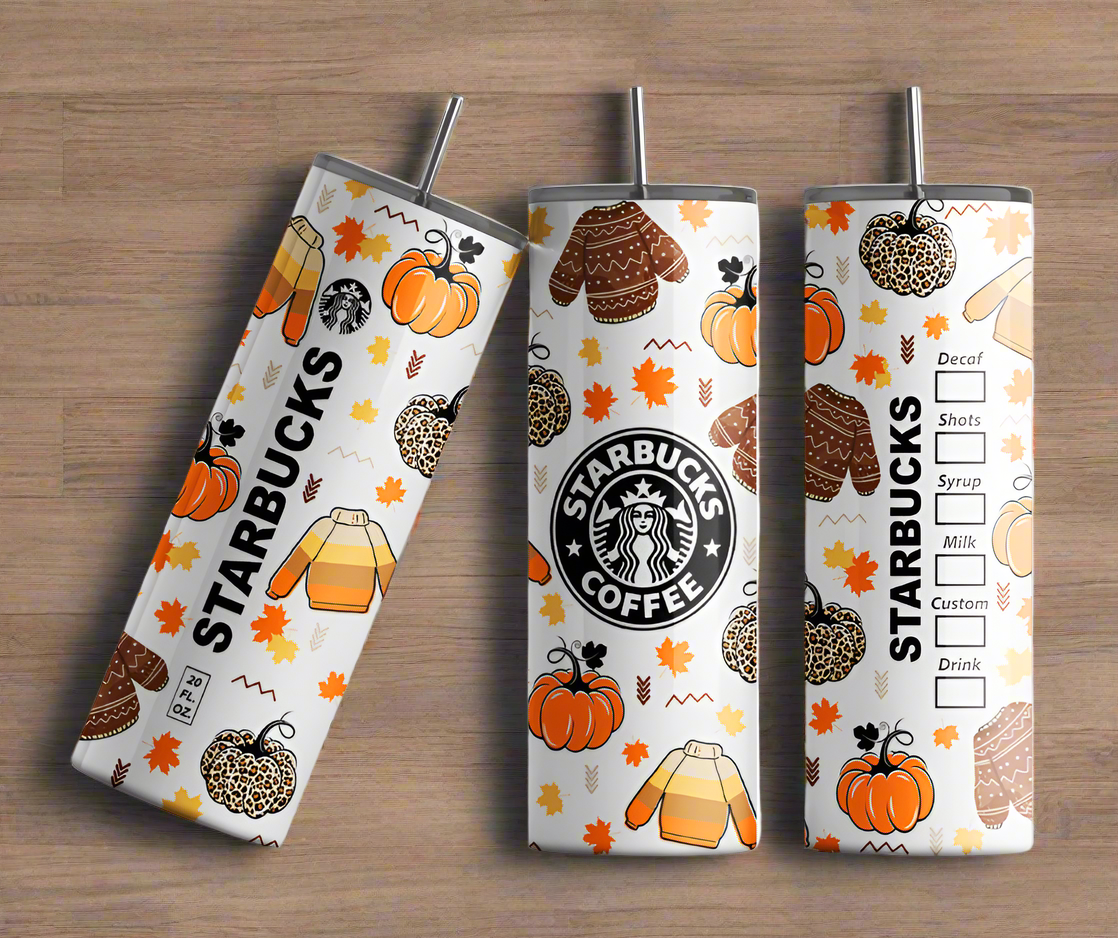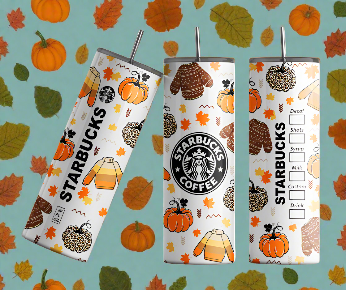 Stay warm and stylish this autumn with our 20-ounce fall-themed tumbler! Perfect for pumpkin spice lattes, hot cocoa, or your favorite fall beverage, this tumbler is decorated with adorable seasonal graphics, including cozy sweaters, pumpkins, and autumn leaves. Featuring a Starbucks-inspired design with a customizable drink order section, this tumbler brings all the cozy vibes of your favorite coffee shop straight to your hands.
