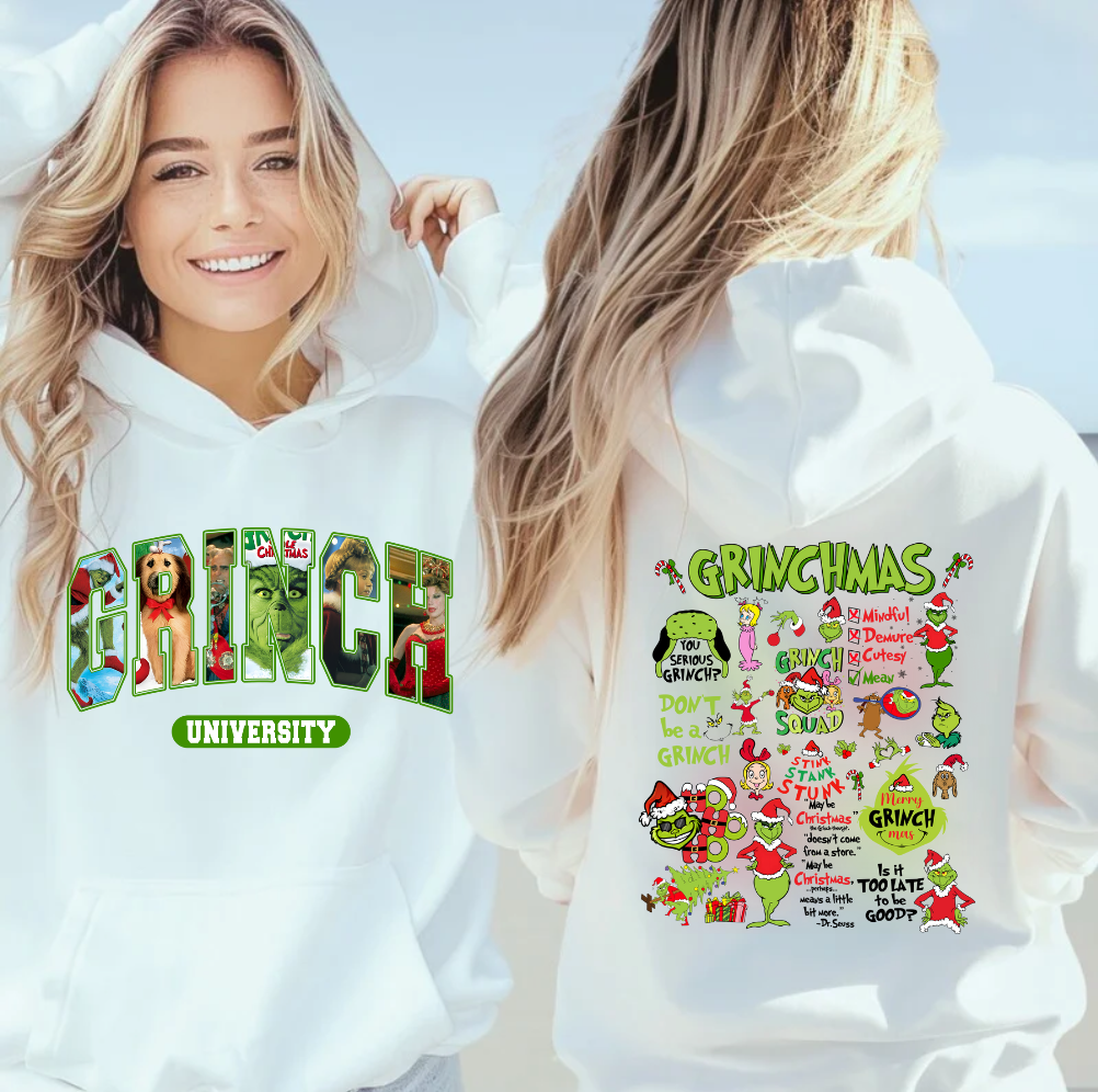 Embrace your inner Grinch with our “Grinch University” Hoodie! This cozy and playful hoodie features a vibrant “GRINCH” graphic on the front, filled with iconic scenes from the beloved Christmas classic, and a whimsical “Grinchmas” guide on the back. Perfect for fans who relate to the Grinch’s holiday humor, this hoodie adds a festive twist to your winter wardrobe, making it ideal for holiday gatherings, gift exchanges, or just a casual day out.