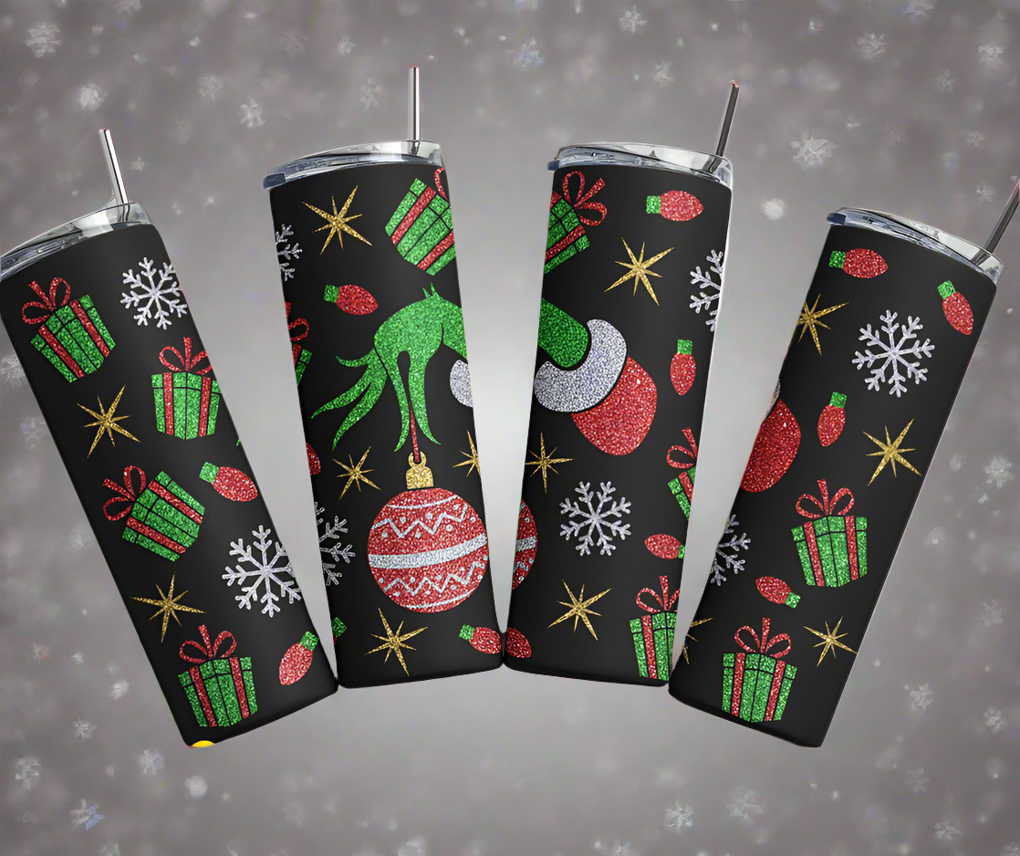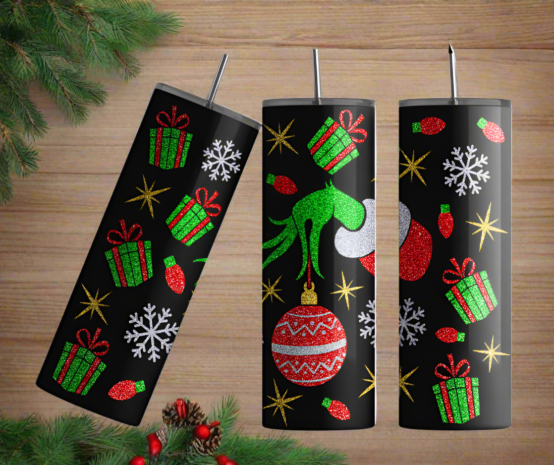 Add a sparkle to your holiday season with this festive glitter tumbler! Featuring a sleek black background decorated with vibrant Christmas icon Mr. Grinch’s hand holding a beautiful red ornament. In glittery wonderland of gift boxes, snowflakes, ornaments, and twinkling stars—this tumbler brings holiday cheer to every sip. Perfect for hot cocoa, coffee, or holiday cocktails, it’s a stylish way to enjoy your favorite drinks all season long. Hot or cold.
