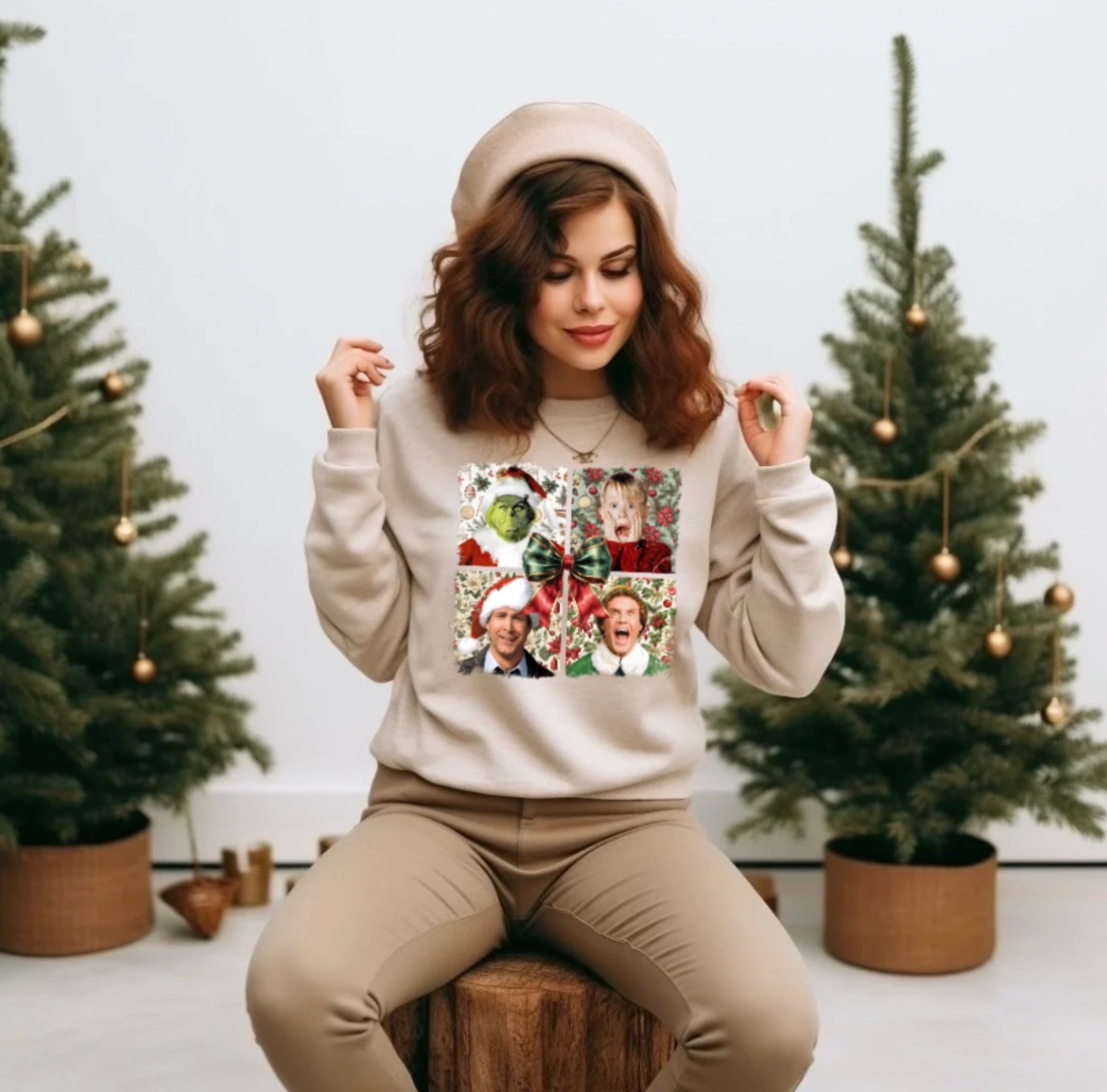 Celebrate the holiday season with the ultimate Holiday Movie Marathon Sweatshirt! Featuring a vibrant collage of iconic Christmas characters like the Grinch, Kevin from Home Alone, Buddy the Elf, and Clark Griswold, this sweatshirt brings together beloved faces from your favorite festive films. Perfect for cozy nights in, Christmas gatherings, or movie marathons, this sweatshirt is a must-have for any holiday movie enthusiast.