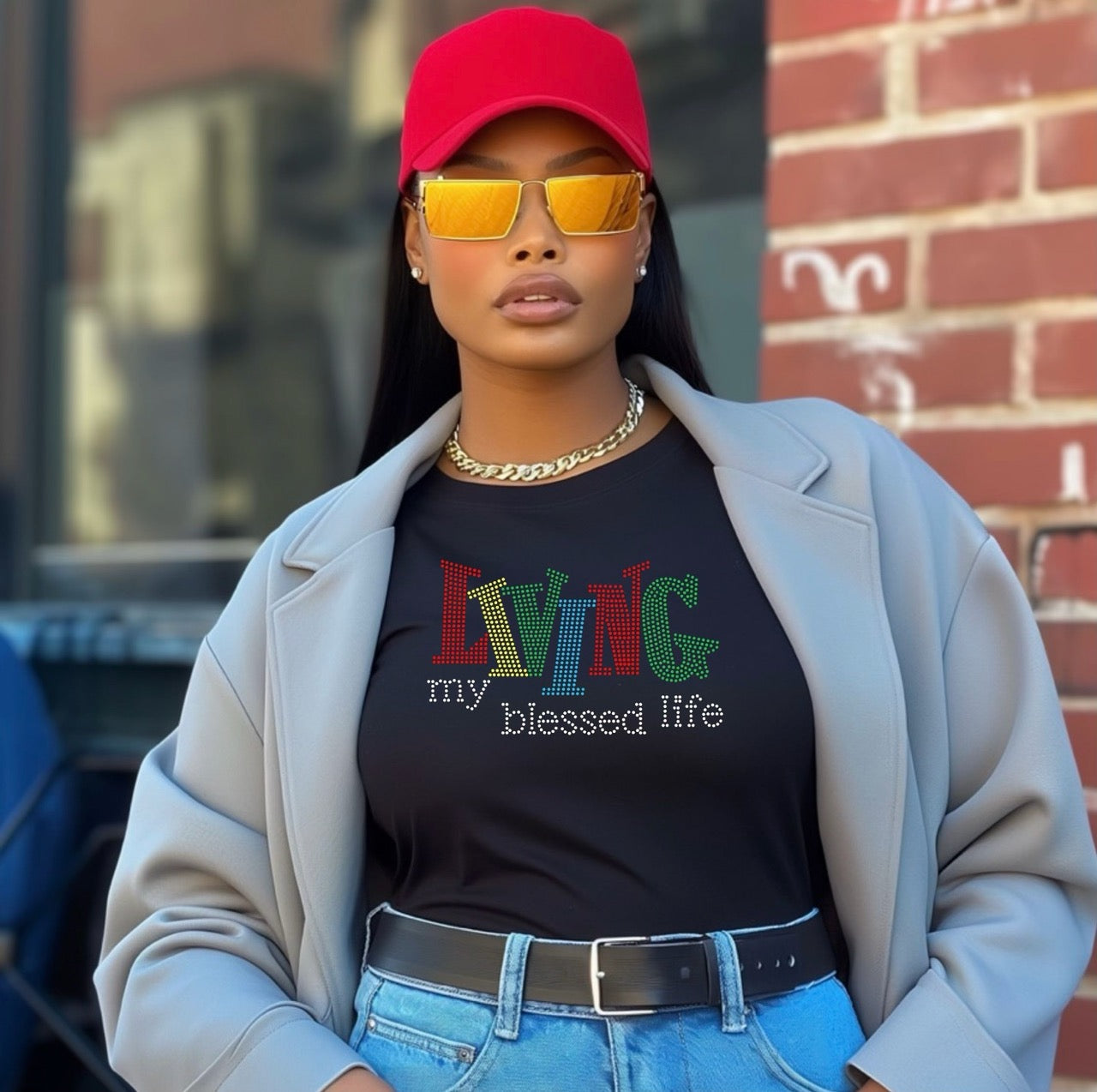 Embrace your blessings with our "Living My Blessed Life" rhinestone T-shirt. Featuring a colorful, sparkling design, this tee is a beautiful reminder to celebrate life's blessings every day. Made with soft and comfortable fabric, it's perfect for casual wear, church events, or simply sharing positivity wherever you go.
