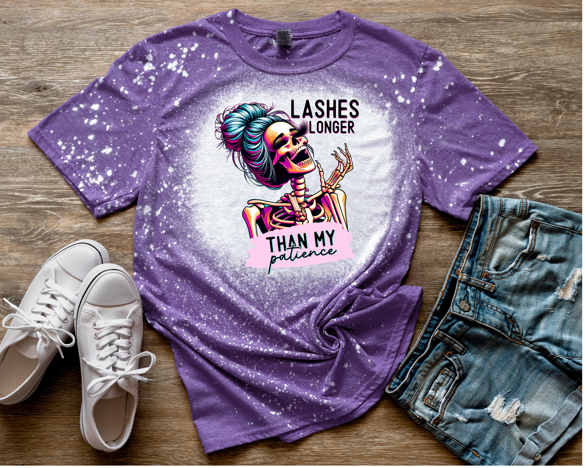 Show off your sass and style with our "Lashes Longer Than My Patience" bleached T-shirt. Featuring a trendy skeleton graphic with bold colors, this shirt combines humor and attitude for a fun and fashionable look. The stylish bleached effect adds a unique touch, making it perfect for casual outings or expressing your personality.